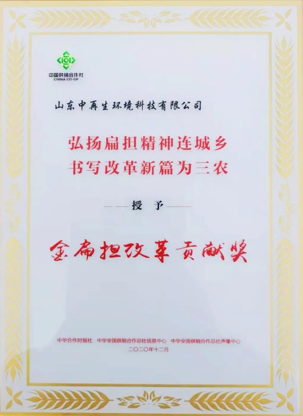 為宣傳貫徹習近平總書記關于供銷合作社工作重要指示精神,大力推進供銷合作社培育壯大工程,全方位打造供銷合作社為農服務金字招牌,在中華全國供銷合作總社指導下,中華合作時報社等單位開展了“尋找扁擔傳人”主題宣傳活動暨全國供銷合作社城鄉(xiāng)優(yōu)選服務傳播計劃,邀請各省、自治區(qū)、直轄市及新疆生產建設兵團供銷合作社推薦一批2020年度為供銷合作事業(yè)發(fā)展作出突出貢獻的集體、服務項目(品牌)和個人。經組委會篩選與核實,報總社相關部門審核后,最終確定授予93個集體(服務項目)、57名個人 “金扁擔改革貢獻獎”、“紅背簍精神傳承獎”和全國供銷合作社城鄉(xiāng)優(yōu)選服務榮譽稱號,為全國供銷合作社系統(tǒng)樹立改革發(fā)展標桿,弘揚新時代供銷合作社精神,激勵砥礪奮進的士氣。山東中再生環(huán)境科技有限公司環(huán)保管家服務項目榮獲金扁擔改革貢獻獎(集體)。